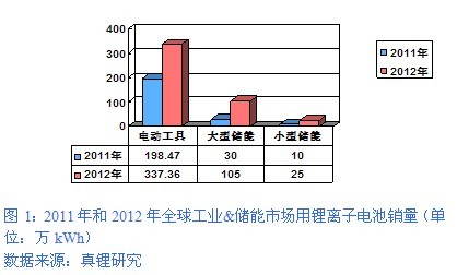 工業(yè)&儲能市場的發(fā)展情況與交通工具領域類似。2012年全球工業(yè)&儲能市場所需的鋰離子電池總量為467.36萬kWh,總量占比只有12.25%,但較2011年的238.47萬kWh增長了95.98%,其增量在2012年1153.16萬kWh的絕對增量中占到了19.85%。