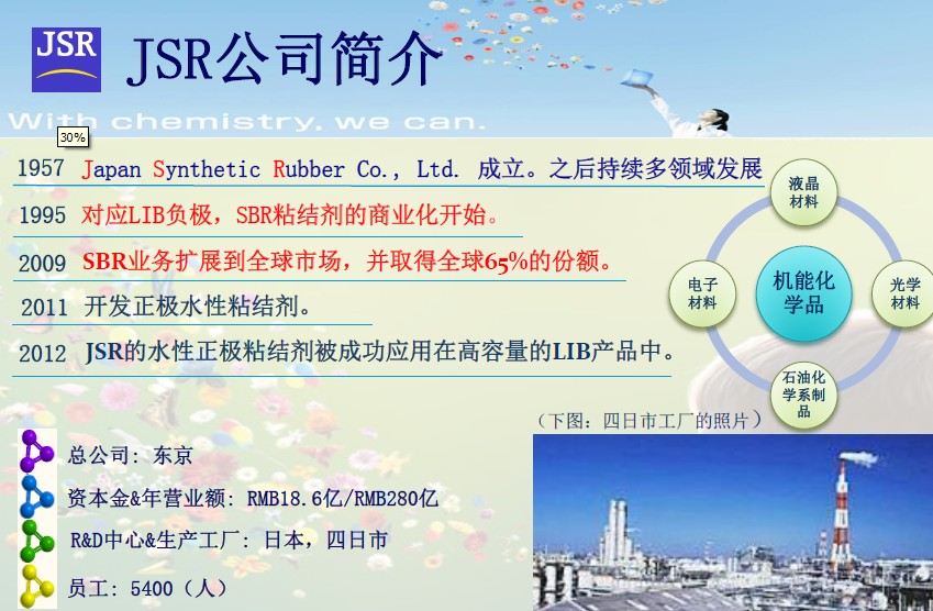 JSR株式會社是一家致力于開發和生產石化和精細化工產品的全球性化工企業,JSR提供用于電池電極的水性粘結劑并擁有市場的領導地位。JSR的SBR水性負極粘結劑目前被全球多家領先電池企業使用