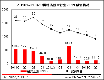 圖1 2011Q1-2013Q2中國清潔技術行業VC/PE融資情況