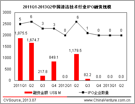 從細分領域來看,2013年第二季度我國清潔技術行業披露的2起融資案例分布于太陽能、污染監測與治理行業,分別是湘電新能源以及中持水務(見表1)。