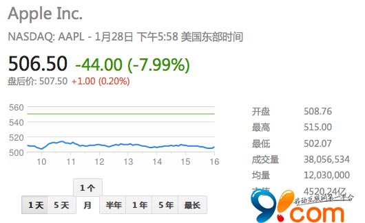 蘋果股價近日大幅下跌逾7%,原因是該公司昨日公布的2014財年第一季度財報業績令投資者感到失望,而且該公司所提供的第二季度營收展望也十分謹慎。近日蘋果股價在納斯達克市場的常規交易中下跌41.84美元,至508.67美元,跌幅為 7.60%,此前曾觸及502.07美元的低點。過去52周,蘋果的最高股價為575.14美元,最低股價為385.10美元。