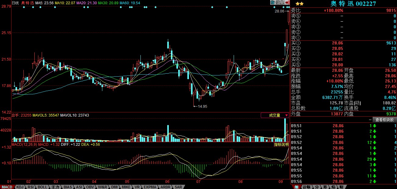 受上周末新能源汽車補貼預期利好刺激,9月9日早盤,新能源汽車、鋰電池產業鏈概念上市公司出現整體上漲行情,其中充電樁概念股奧特迅(002227),開盤不久就被巨量買盤封至漲停,截止本網發稿時,該股上漲10%,價格為28.06元。同時,比亞迪、杉杉股份、西部資源漲幅居前。