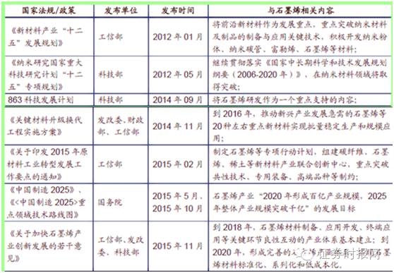 《中國(guó)制造2025》明確了石墨烯發(fā)展目標(biāo),文件指出到2020年“規(guī)模制備及電化學(xué)儲(chǔ)能、印刷電子、航空航天用輕質(zhì)高強(qiáng)復(fù)合材料、海洋工程防腐等應(yīng)用領(lǐng)域的技術(shù)水平達(dá)國(guó)際領(lǐng)先,大幅提升相關(guān)產(chǎn)品性能,形成百億元產(chǎn)業(yè)規(guī)模。到2025 年突破石墨烯在電子信息領(lǐng)域應(yīng)用的技術(shù)瓶頸,整體產(chǎn)業(yè)規(guī)模突破千億。”