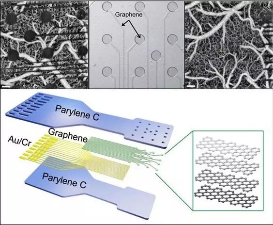 由DARPA的RE-NET計劃所資助開發的新的石墨烯傳感器技術是可以導電的,且只有4個原子厚,比目前的觸點薄數百倍(上中)。這種極薄的厚度使幾乎所有的光可以穿越很寬范圍的波長。放置在一塊與組織形狀相符的柔性塑料里襯上之傳感器(下方)是概念驗證工具的一部分,它展示出了更小、更具透光性的觸點,且可同時使用電氣和光學方法來對神經組織進行測量與刺激(右上)。數據源:DARPA。