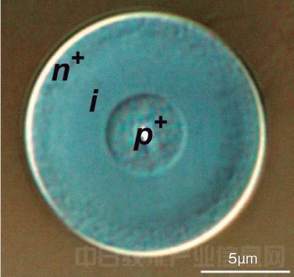 PSU化學(xué)教授John Badding等的研究小組采用以同心圓狀制備p+型、i型及n+型硅半導(dǎo)體的技術(shù),在光纖的核心部分制備了pin結(jié)。具體做法是用高壓化學(xué)氣相沉積法(CVD)向中空的光纖內(nèi)部吹入硅烷(SiH4)氣體,通過(guò)溫度控制等使其結(jié)晶而成。