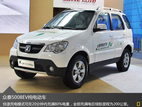 眾泰5008EV在底盤中部安置了大容量鋰離子電池,最大功率27kW,最高車速110km/h,充滿電后續航里程為200公里以上,百公里耗電僅12度。其配置的車載充電機可選擇家用充電或快速充電兩種模式,前者充電僅需6-8小時,而快速充電模式可在20分鐘內充滿80%電量。