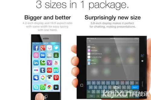 概念iPhone6帶來革命性的改變,將iPhone、iPad合二為一。屏幕能夠在4.2寸、5.8寸和7.5寸之間任意切換。4.2英寸顯示屏,方便單手操作;5.8英寸顯示屏,聊天、辦公更加順暢。