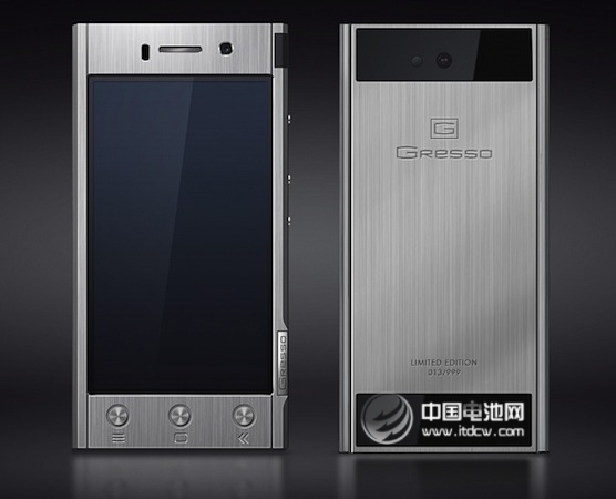 Gresso 這間廠商在過去只生產 feature phone 以及將 iOS 裝置變成土豪版本,不過現在它的野心擴張,要自行生產豪華智慧型手機了。上圖這款 Radical R1 是一款機身和按鍵都是以鈦金屬制成的限量版豪華手機,起步價是 US$1,800(約人民幣 10,930 元),規格平庸,包括 4.5 吋 qHD 螢幕、支援雙 SIM 卡、8MP 主相機、36GB 內置儲存量、1.2GHz 四核心、219g 的重量以及運行 Android 4.1.2。
