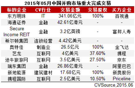 在今年5月份完成的重大并購交易案例中,百視通吸收合并東方明珠、自然人史玉柱增持海通證券和富邦人壽收購Secure Income REIT資產分別位列本月并購市場完成交易規模前三位(見表2)。2014年11月21日,百視通新媒體股份有限公司(600637.SS)擬以新增股份換股吸收合并上海東方明珠(集團)股份有限公司(600832.SH)。百視通換股價格為32.54元/股,東方明珠換股價格為10.69元/股,東方明珠與百視通的換股比例為3.04:1,本次換股吸收合并中,百視通向東方明珠全體股東發行股份的數量1,048,136,470股。2015年5月27日,本次換股重組交易完成。