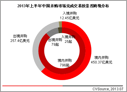 根據ChinaVenture投中集團統計,2013年上半年中國并購市場已完成交易案例共900起,披露并購交易金額共720.23億美元,案例平均并購金額8003萬美元。其中跨境并購交易規模為269.85億美元,占比為37%;跨境并購案例數量達104起,數量占比為12%(見圖5)。