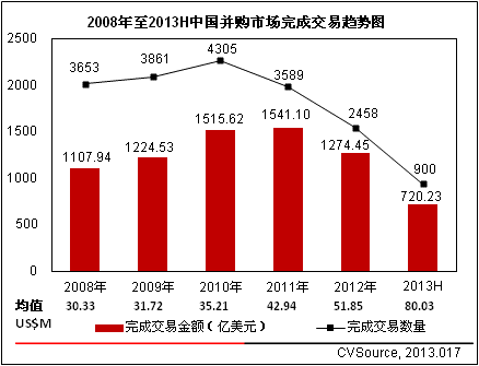 圖2 2008年至2013H中國并購市場完成交易趨勢圖