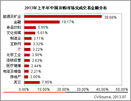 2013年上半年,中國并購市場完成交易規模720.23億美元,平均單筆交易規模8003萬美元,交易完成案例900起,案例數量占去年全年不足37%,自去年底境內外資本市場的持續低迷,作為大買方的上市公司資金鏈趨緊是并購交易案例數量下降的主要原因。另外,無論是宣布并購交易還是完成并購交易來看,交易案例數量在2010年達到最高值后都開始呈現緩慢下降,凸顯出中國企業參與并購交易一改以往粗放、盲目的并購初衷,戰略化布局考量以及謹慎的并購腳步將利于國內并購市場健康有效發展。