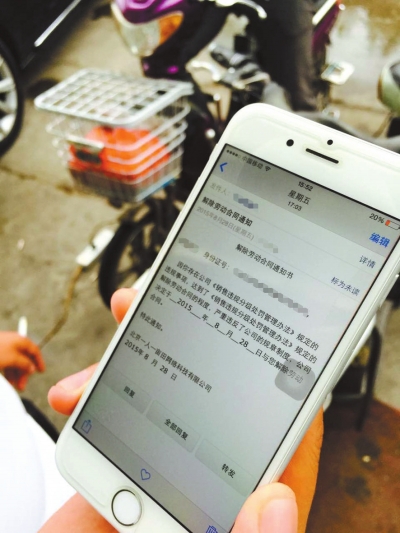 這份于上周五下午發(fā)出的郵件稱,“因你存在公司《銷售違規(guī)分級處罰管理辦法》規(guī)定的違規(guī)事項(xiàng),達(dá)到了《銷售違規(guī)分級處罰管理辦法》規(guī)定的解除勞動合同的程度,嚴(yán)重違反了公司的規(guī)章制度,公司決定于2015年8月28日與您解除勞動合同”。