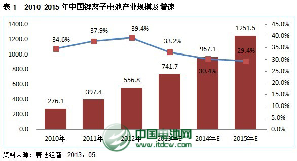 未來五年,傳統小型鋰離子電池將在平板電腦和超級本的帶動下呈現穩定增長的趨勢,動力電池和儲能電池將是鋰離子電池產業新的增長點。預計到“十二五”末將增長到1251.5億元,復合增長率預計達到30%以上。