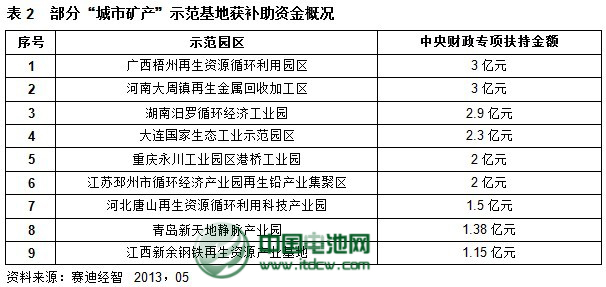 “城市礦產”示范基地是享有優惠政策、提升園區競爭力的重要途徑。目前國家對“城市礦產”示范基地給予一定程度補貼,在具體補貼上,國家補貼給園區,最終落實到園區的項目里。補助方式為預撥和清算相結合,預撥不超過項目補貼資金的15%。按照不同項目的規模和延伸度、投資力度,國家為每個示范基地提供10%的資金配比。整體來看,國家對“城市礦產”扶持力度相當大。例如廣西梧州再生資源循環利用園區獲國家發改委、財政部聯合批復,獲得中央財政專項資金3億元,大大提高了“城市礦產”示范基地的建設力度與競爭力。河南大周鎮再生金屬回收加工區成為國家“城市礦產”示范基地之后,得到3億元扶持資金,前期啟動資金2000萬元已撥付到位。