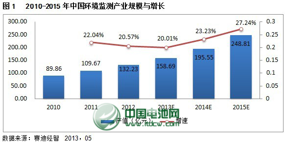 2012年,全國環境監測產業規模達132億元,同比增長21%,其中環境質量監測48億元,同比增長10%;污染源監測產業規模達62億元,同比增長28%;其他環境監測領域產業規模22億元,同比增長21%。隨著環境質量監測、污染源監測、應急監測等領域在覆蓋面和監測指標的不斷擴大和豐富,預計“十二五”期間,環境監測產業將保持22.6%的速度增長,到2015年產業規模將達到249億元。