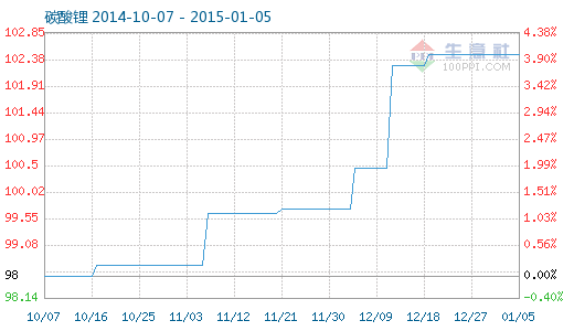 1月5日碳酸鋰商品指數為102.46,與昨日持平,較周期內最高點112.10點(2012-11-04)下降了8.60%,較2014年10月16日最低點98.54點上漲了3.98%。(注:周期指2011-09-01至今)。