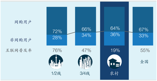 在具體數(shù)字上,第一互聯(lián)網(wǎng)的普及率在一二線達到76%,到三四線是47%,到農(nóng)村19%,但是在被滲透的這些人群當中,用過電子商務網(wǎng)購用戶,19%普及互聯(lián)網(wǎng)的人群里面有64%用過網(wǎng)購。