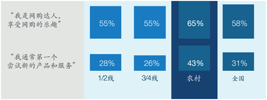 第四,盡管互聯(lián)網(wǎng)在三四線城市和農(nóng)村普及率較低,但這些地區(qū)的大部分消費者都在使用電子商務,網(wǎng)購的比例分別達到了68%和60%。農(nóng)村用戶中的“網(wǎng)絡達人”更是比一線及二線城市多出25%,渴望第一個嘗試新的產(chǎn)品和服務。