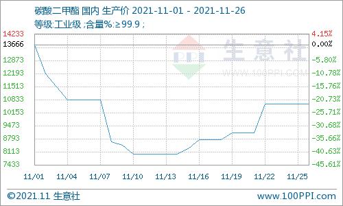 截止11月26日,國產工業級碳酸二甲酯出廠均價參考在10600元/噸,與2021年11月1日(碳酸二甲酯參考價 ... 查閱全文