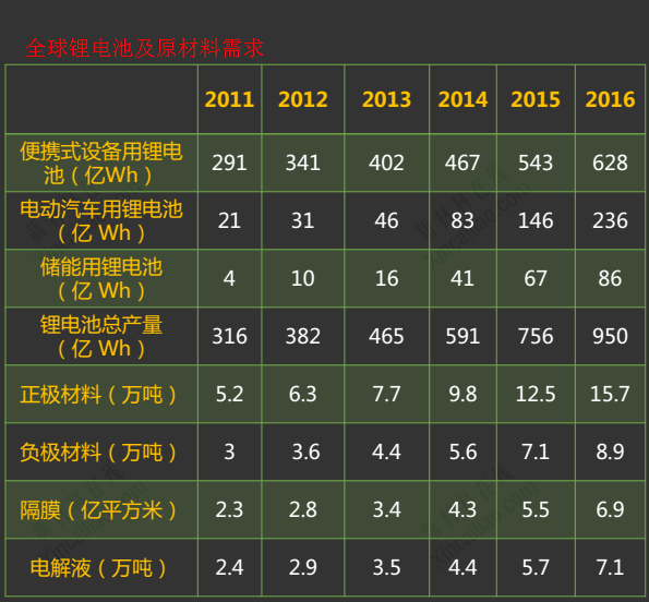 根據(jù)慧博資訊最新研報(bào),需求沖擊導(dǎo)致2015年全球供需平衡表出現(xiàn)了9100噸碳酸鋰短缺。按中國全年30萬輛、歐洲和美國市場最新銷量重估全年需求,全球新能源汽車對碳酸鋰需求已爆發(fā)至3.86萬噸,較市場普遍預(yù)期暴增1.13萬噸。2015年全球碳酸鋰需求預(yù)計(jì)為21.18萬噸,同比增速19.64%。除新能源汽車外,工業(yè)需求12.3萬噸,3C數(shù)碼消費(fèi)品需求5 萬噸,儲能需求1700噸。由于生產(chǎn)工藝、成本偏高等因素,今年多處產(chǎn)能未能充分釋放,預(yù)計(jì)2015年全球鹽湖/礦山提鋰的總產(chǎn)量僅20.28萬噸。 2016年-2018年全球碳酸鋰需求預(yù)計(jì)分別為24.42萬噸、28.89萬噸和34.10萬噸,對應(yīng)增速18.3%、18.0%和19.9%。增長的動力主要來自新能源汽車,若中國新能源汽車產(chǎn)量增速維持100%增長,即使考慮動力電池能量密度上升,2016-2018年全球新能源汽車碳酸鋰需求還將上升至6.41萬噸、9.76萬噸和13.67萬噸。