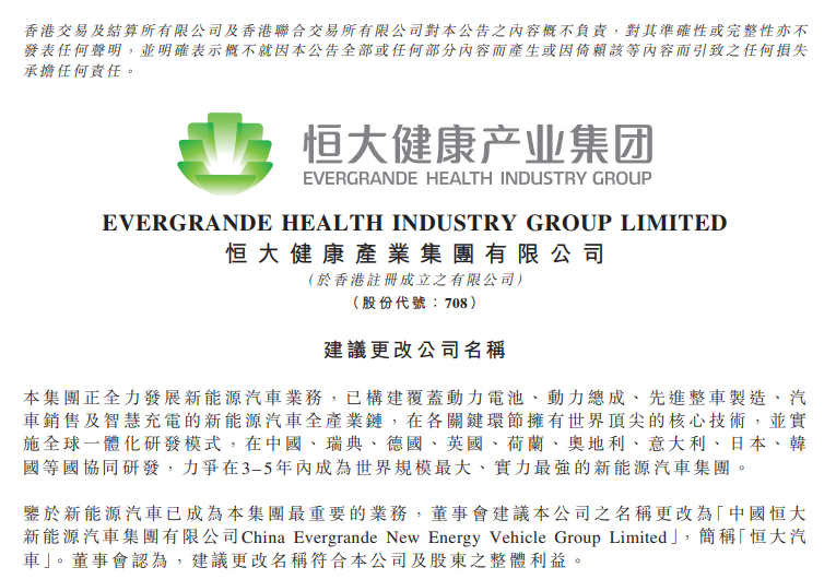 恒大健康產(chǎn)業(yè)集團有限公司已正式更名為中國恒大新能源汽車集團有限公司,股份在聯(lián)交所買賣之 ... 查閱全文
