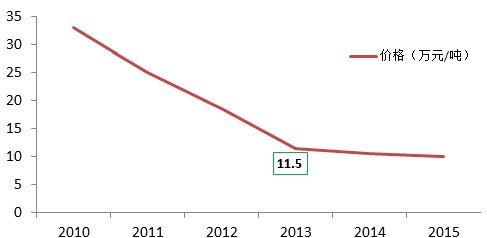 盡管天賜材料實現(xiàn)了六氟磷酸鋰的自給自足,但隨著國內(nèi)企業(yè)在六氟磷酸鋰技術(shù)上的不斷突破,國產(chǎn)化率逐漸的提高,其價格也在逐漸的下滑,預(yù)計2013年價格11.5萬元/噸左右,較2011年下降了65.2%。