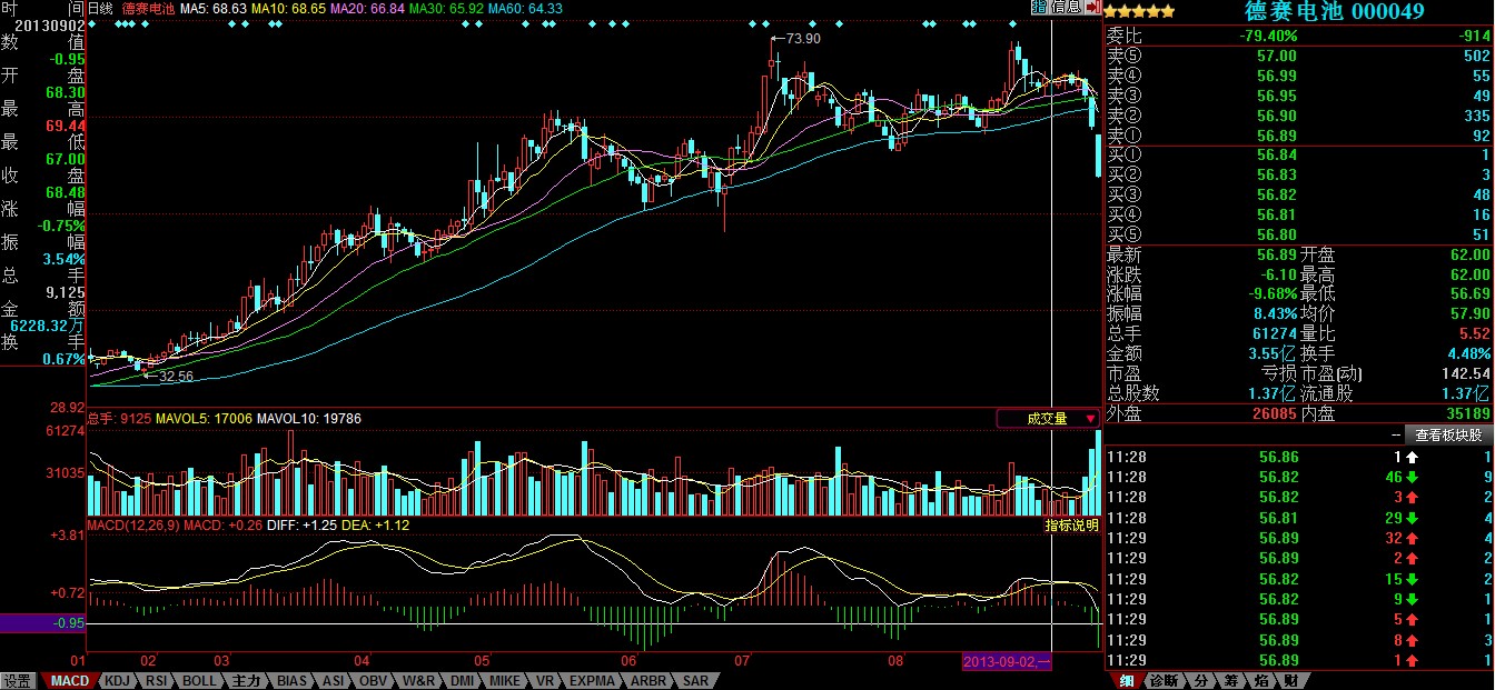 中國電池雜志-中國電池網9月11日訊(肖何 北京報道 ) 受綜合利空消息影響,德賽電池(000049)11日早盤一路狂瀉到跌停,午盤收在56.89元,下挫9.68%。按照流通股本1.3679億股計算,9月9日-11日上