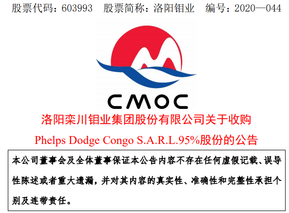 洛陽鉬業(yè)5.5億美元購剛果(金)銅鈷礦95%權(quán)益 資源量3.65億噸