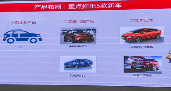 2017是奇瑞“戰略轉型2.0”的成長年,奇瑞也將在今年迎來20周歲,奇瑞提出今年的銷量增速不低于2016年。今年奇瑞計劃重點推出5款新車,其中包括內部代號為T17的一款全新SUV和兩款新能源產品。