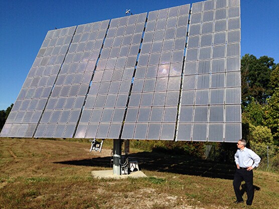 北卡羅萊納州漢德森(Henderson),斯科特·伯勒斯(Scott Burroughs)站在一塊Semprius的太陽能系統前