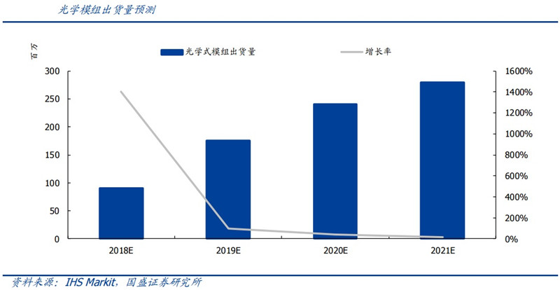 然而,歐菲科技的指紋模組技術(shù)盈利能力同樣不容小覷。國(guó)盛證券指出,隨著光學(xué)指紋識(shí)別產(chǎn)業(yè)鏈的初步成熟,供應(yīng)鏈的進(jìn)一步完善,屏下指紋識(shí)別應(yīng)用規(guī)模將顯著擴(kuò)大,同時(shí),隨著國(guó)內(nèi)OLED面板廠商的生產(chǎn)能力逐漸導(dǎo)入,目前只適用于OLED屏幕的光學(xué)式和超聲波式屏下指紋識(shí)別方案的成本將會(huì)逐漸下降,光學(xué)式屏下指紋識(shí)別方案的滲透率將進(jìn)一步提升。根據(jù)IHS Markit數(shù)據(jù)預(yù)測(cè),2018光學(xué)式指紋識(shí)別模組的出貨量將預(yù)計(jì)超過(guò)9000萬(wàn)顆;2019年繼續(xù)保持高速増長(zhǎng),出貨量預(yù)計(jì)將超過(guò)1.75億顆;至2021年預(yù)計(jì)將超過(guò)2.8億顆,對(duì)光學(xué)指紋傳感器(CIS)的需求潛力巨大。
