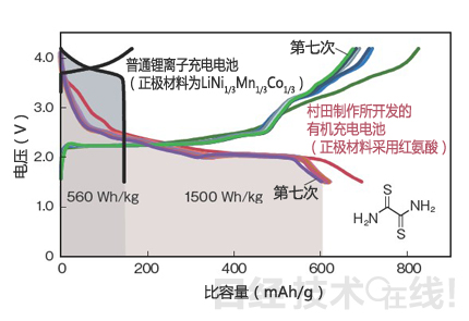 村田制作所計劃有機化合物“采用紅氨酸,力爭2020年前后實現(xiàn)業(yè)務化”(該公司)。紅氨酸如果發(fā)生四電子反應,就能實現(xiàn)890mAh/g的理論容量。在本屆電池研討會上,作為本田技術(shù)研究所與日本Carlit的共同研究成果,展示了正極材料采用紅氨酸的半電池單元的充放電特性(圖13)注7)。初次放電時的容量為750mAh/g,第二次以后穩(wěn)定在650mAh/g。反復充放電100次后也保持了430mAh/g的比容量。
