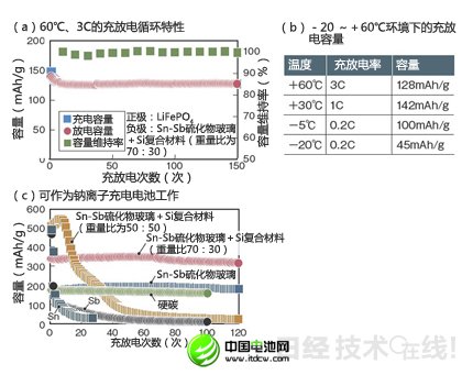 五鈴精工硝子開發(fā)出了經(jīng)過150次循環(huán)充放電后實現(xiàn)99%的容量維持率的鋰離子充電電池(a)。可在-20~+60℃的大溫度范圍內(nèi)使用(b)。特點是負極材料采用了Sn-Sb硫化物玻璃,還可用于鈉離子充電電池(c)。(圖由《日經(jīng)電子》根據(jù)五鈴精工硝子的資料制作)
