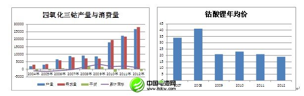 鈷酸鋰的上游原材料主要是四氧化三鈷,據(jù)浙江某大型四氧化三鈷廠商2012年的產(chǎn)量統(tǒng)計顯示,2012年全年其四鈷銷量達(dá)5100噸以上,同比增長超過50%,躍居國內(nèi)首位,在全行業(yè)供應(yīng)過剩、下游需求放緩的大背景下,四鈷不得不說是個實足的亮點。