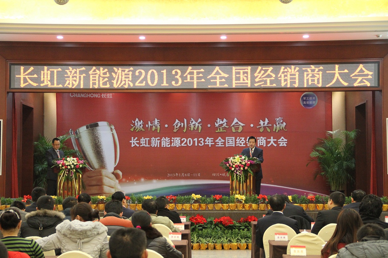 近日,由四川長虹新能源科技有限公司主辦,來自全國各地80余位營銷精英參與的“激情 創新 整合 共贏——長虹新能源2013年全國經銷商大會”隆重舉行。 會上,長虹新能源公司總經理郭龍就