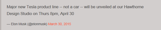 3月31日消息,據(jù)國外媒體報道,特斯拉CEO伊隆·馬斯克(Elon Musk)周一透過其個人Twitter賬號表示,公司將于美國太平洋時間4月30日晚上8點在Hawthorne Design Studio(特斯拉霍桑設計工作室)為旗下非汽車類全新產(chǎn)品線揭開神秘面紗。