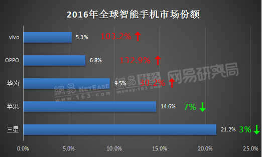 圖1 2016年全球智能手機銷量排名前五 (數據來源:IDC 制圖:網易研究局)