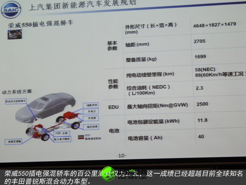 榮威550插電式混合動力轎車是上汽基于自主品牌榮威550 車型,自主開發(fā)的混合動力轎車。該車應(yīng)用了全新自主研發(fā)的混合動力系統(tǒng)(包括動力電池系統(tǒng)、電力電子箱、電驅(qū)變速箱)、整車電轉(zhuǎn)向系統(tǒng)、電空調(diào)系統(tǒng)和熱管理系統(tǒng)。與傳統(tǒng)榮威550車型相比,該車節(jié)油率超過50%,百公里綜合油耗僅為2.3L,并滿足國5排放標(biāo)準(zhǔn),已實現(xiàn)量產(chǎn)。