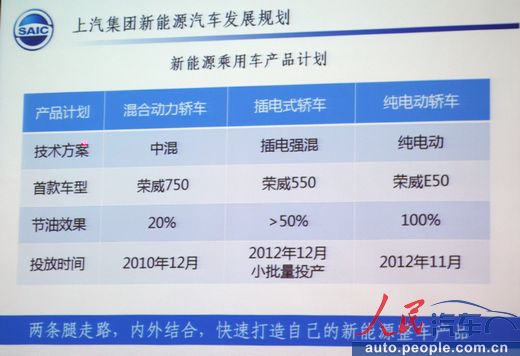 上汽集團相關負責人在接受記者采訪時表示,插電式強混和純電動是上汽在新能源車發展方面的主攻方向。其總體目標是:達到國內新能源汽車20%市場占有率;同時,通過實施節能和新能源汽車戰略,快速降低公司平均燃油消耗值。