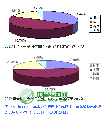 中國電解液企業(yè)(這里僅指大陸地區(qū))2012年共銷售電解液2.28萬噸,較2011年的1.50萬噸增加了48.70%;同時,中國企業(yè)2012年的全球市場份額,也由2011年的48.70%上升到51.70%,首次突破一半。其中,中國五大電解液企業(yè)國泰華榮(Guotai-Huarong)、天津金牛(Jinniu)、東莞杉杉(Shanshan)、深圳新宙邦(Capchem)、廣州天賜(Tinci)共實現(xiàn)銷量1.66萬噸,占比72.81%。