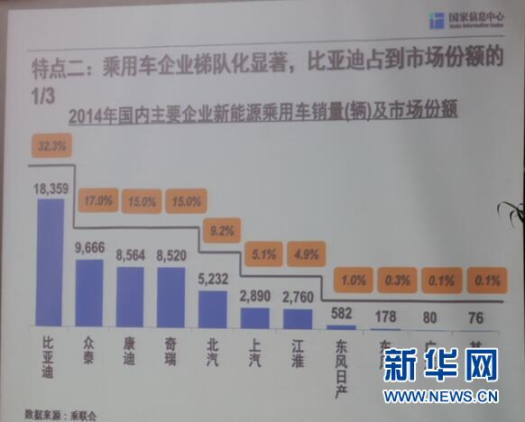 據(jù)國家信息中心信息資源開發(fā)部徐長明主任介紹,近期中國新能源汽車市場呈現(xiàn)三個發(fā)展特點:其一,2014年以來爆發(fā)式增長明顯,且純電動與插電混動同步發(fā)展;其二,乘用車企業(yè)梯隊化顯著,比亞迪占到市場份額三分之一;其三,需求區(qū)域主要集中在北上廣杭等少數(shù)城市。
