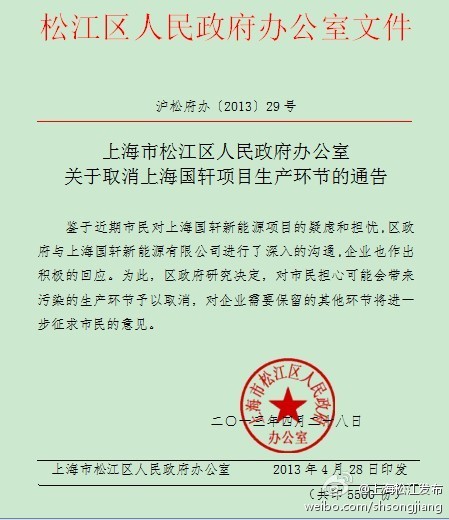 記者28日從上海市松江區人民政府官方微博“松江發布”獲悉,鑒于近日市民對于上海國軒新能源項目的疑慮和擔憂,松江區政府與“上海國軒”進行了深入溝通,企業也作出積極回應。