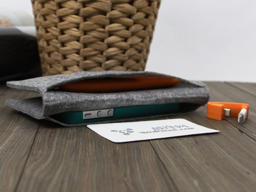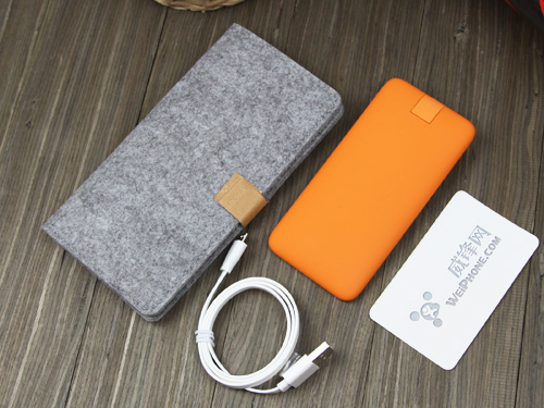 拆開包裝可以看到除了一塊背夾電源之外,里邊裝有一個毛氈環保包、一根扁平防纏繞的USB充電線和一個iPhone 5的轉接頭。