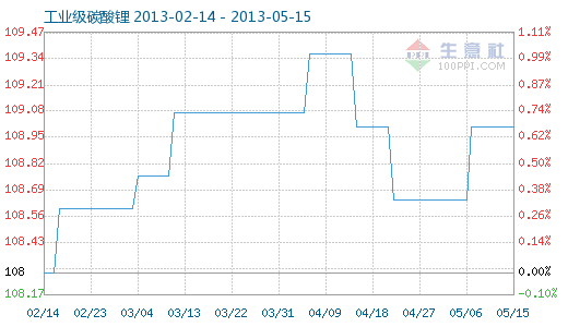 5月15日工業(yè)級碳酸鋰商品指數(shù)為109.01,與昨日持平,較周期內(nèi)最高點112.10點(2012-11-04)下降了2.76%,較2012年01月05日最低點98.94點上漲了10.18%。 工業(yè)級碳酸鋰商品指數(shù)自2013-5-6起,10天陸續(xù)上漲了