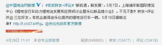 據(jù)統(tǒng)計(jì),參與本次“轉(zhuǎn)發(fā)+評(píng)論”活動(dòng)的網(wǎng)友轉(zhuǎn)發(fā)達(dá)13471次,評(píng)論達(dá)12413次,微博閱讀展示與曝光量達(dá)846254次。活動(dòng)結(jié)束后,仍有不少網(wǎng)友繼續(xù)轉(zhuǎn)發(fā)和評(píng)論,不少網(wǎng)友希望中國(guó)電池網(wǎng)多舉辦一些這樣的活動(dòng)來(lái)推廣環(huán)保、綠色、低碳的鋰電自行車(chē)。福建省自行車(chē)電動(dòng)車(chē)行業(yè)協(xié)會(huì)會(huì)長(zhǎng)、樂(lè)比(上海)科技有限公司董事長(zhǎng)林曦表示,讓更多的人通過(guò)微活動(dòng)、通過(guò)中國(guó)電池網(wǎng)了解樂(lè)比,十分有意義,樂(lè)比會(huì)在今后多舉辦一些消費(fèi)者、網(wǎng)友能互動(dòng)、參與的有意義的活動(dòng),讓更多的人了解鋰電自行車(chē)、鋰電池行業(yè)。