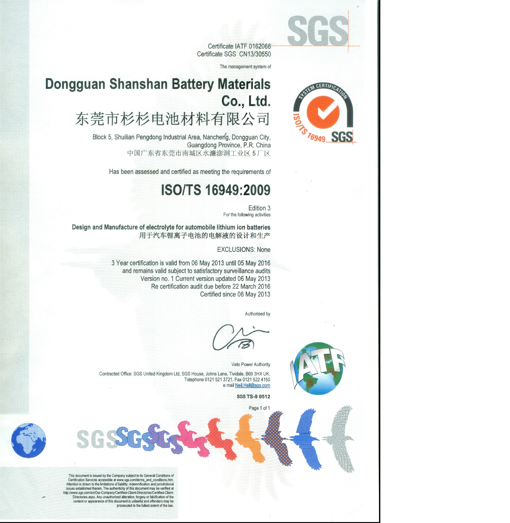 隨著鋰離子動力電池在汽車上的應用和推廣,作為其原材料供應商也必須嚴格按TS16949進行生產管理;東莞杉杉也為此做出巨大努力,自2011年開始導入試運行TS16949,經過近2年時間的整改已于2013年3月通過TS16949審核,并于2013年5月取得證書。