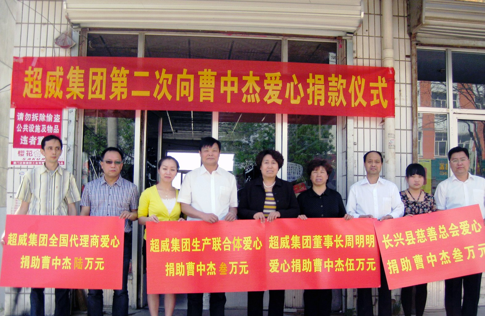 去年11月22日,超威集團(tuán)領(lǐng)導(dǎo)得知山西廣靈代理商曹中杰患病急需手術(shù)治療,家庭特別困難時(shí),當(dāng)日下午,超威集團(tuán)黨委就立即開展了愛心捐助活動(dòng),集團(tuán)黨委書記、總裁楊新新帶頭捐款,現(xiàn)場(chǎng)共收到捐款11750元。黨員的愛心捐助行動(dòng)感動(dòng)了集團(tuán)廣大員工,一場(chǎng)大愛行動(dòng)在全國(guó)各地的代理商中匯成了愛的潮流。截止去年11月30日,共收到捐款40510元。