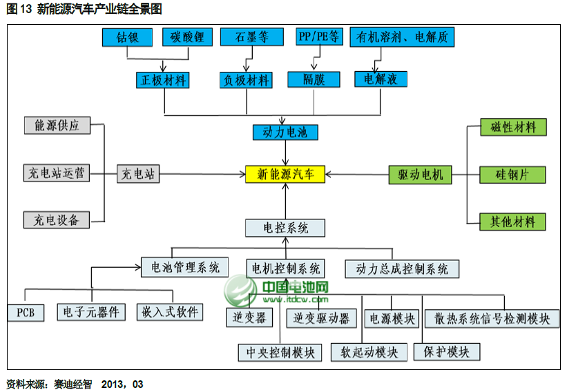 從產(chǎn)業(yè)鏈的角度來講,新能源汽車產(chǎn)業(yè)往上可延伸到鋰、稀土、鎳、錳等金屬礦產(chǎn)資源,往下包含新能源汽車整車運營及服務(wù)等環(huán)節(jié)。其中整個產(chǎn)業(yè)鏈包含高性能電池材料(正極材料、負(fù)極材料、隔膜、電解液)、動力電池、電池管理系統(tǒng)、驅(qū)動電機、稀土永磁材料、汽車控制系統(tǒng)、充電站、充電設(shè)備等細(xì)分環(huán)節(jié)。