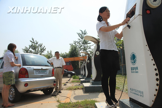 6月15日,山東濱州市市民靳倫杰在濱城區供電公司“加電站”,僅用了十幾分鐘的時間,就為自己的愛車加足了電。劉春迎 攝
